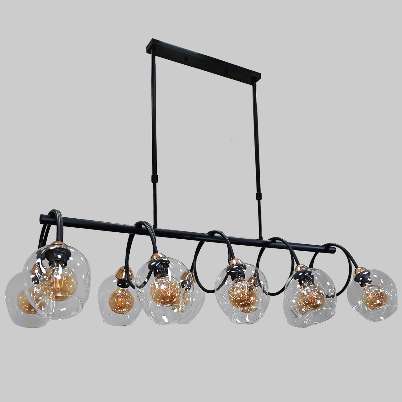 Цікава та стильна люстра ідеально доповнить ваш інтер'єр. Унікальна люстра підійде до інтер'єру в стилі неокласицизм, мінімалізм, хай-тек, модерн і т.д. Вона ідеально доповнюватиме вашу спальню, вітальню, кухню у вашому будинку/квартирі або, наприклад, кафе, ресторан. Корпус зроблений з металу та покритий чорною матовою фарбою, його доповнюють прозорі скляні плафони, що створює стильне поєднання. Ця модель підійде для стандартних і високих стель, тому що регулюється довжина центральних трубочок, завдяки чому ви можете встановити висоту її так, як вам буде зручно (75-112 см). Люстра розрахована на 10 ламп і даватиме достатньо освітлення для приміщення 20-30 кв.м.