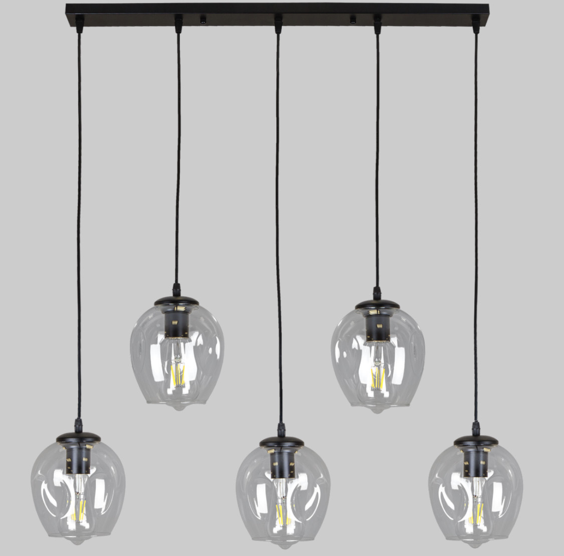Цікава та стильна люстра ідеально доповнить ваш інтер'єр. Унікальна люстра підійде до інтер'єру у стилі лофт, мінімалізм, модерн тощо. Вона ідеально доповнюватиме вашу спальню, вітальню, кухню у вашому будинку/квартирі або, наприклад, кафе, ресторані. Корпус зроблений з металу та покритий чорною фарбою, його доповнюють прозорі скляні плафони, що створює стильне поєднання. Регулюється довжина кожного підвісу окремо (20-120см), завдяки чому можна встановити висоту люстри максимально комфортно. Люстра розрахована на 5 ламп і даватиме достатньо освітлення для приміщення 15-20 кв.м.