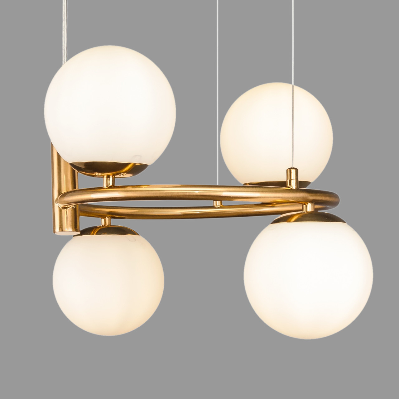 Сучасна підвісна люстра з оригінальним дизайном стане стильним акцентом у будь-якому інтер'єрі. Бронзове металеве кільцева основа в поєднанні зі скляними плафонами створює гармонійний баланс між строгістю та легкістю. Люстра чудово підходить для оформлення вітальні, кухні, спальні або кафе у стилях модерн, мінімалізм чи лофт. Чотири джерела світла забезпечують рівномірне освітлення приміщення площею до 12–15 м². Висота конструкції регулюється, що дозволяє адаптувати її під будь-який простір.
